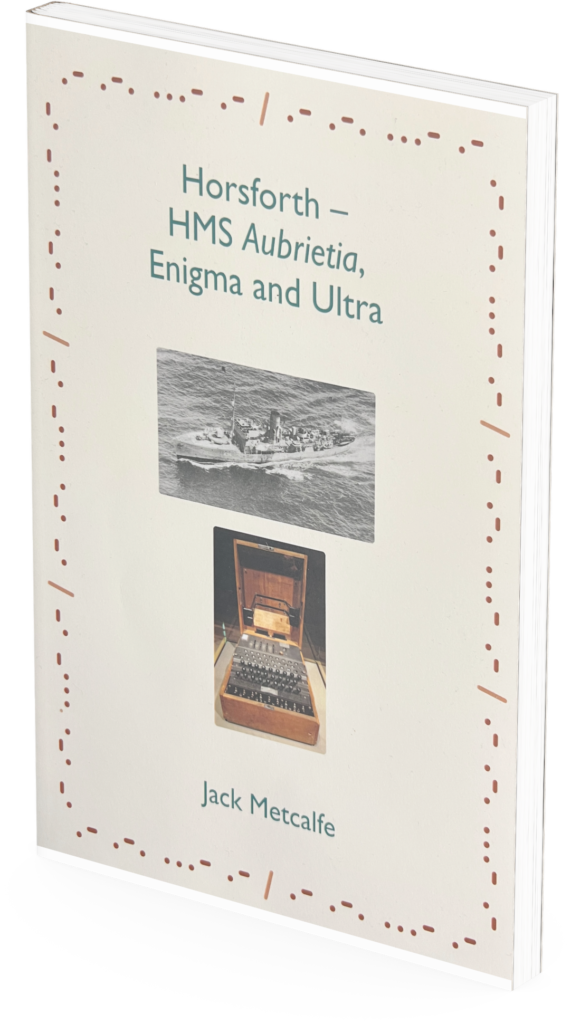 The book cover is bordered by morse code signals, showing just one of the skills Jack deployed during his Royal Air Force military service, first in England, then Germany, between 1958-1961. Also, the cover shows the image of the actual Enigma machine, recovered from the German U-Boat U110, plus the image of HMS Aubrietia.